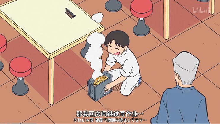 回到具体情节,还能发现石立监督偏爱的剪辑方式——“动作顺接”。这虽是剪辑基础,但与真人电影、漫画相比仍有差异:真人电影受限于空间,需要在有限范围内摆放多台摄像机;漫画则喜欢用一个个分镜框,将角色“困”在画面中。而动画没有这些限制,比如某个“从俯视到仰视”的镜头:通过视角转化增加画面纵深,为后续“角色将物品投掷到另一个房间”的动作增强力度,既突出了角色的疼痛程度,又将其转化为笑果。这种分镜是动画独有的,也能看出,相较于那些擅长借鉴电影的“影迷监督”,石立太一的创作灵感,更多来自自身高超画技带来的“动画师视角”。
