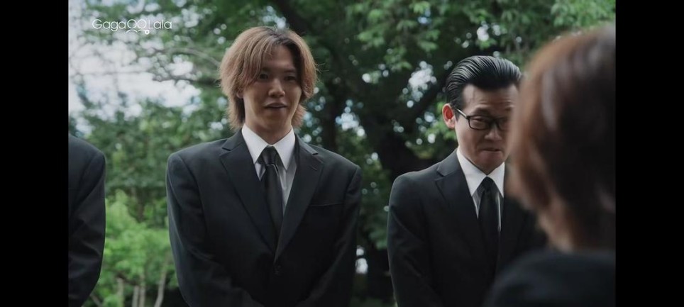 比如花心:三代目年轻的时候也是个帅哥,一生风流倜傥,阅女无数,说白一点就是非常好色,所以底下的小弟对于“攻是老大私生子”的传言没有一个人怀疑过,因为大家都觉得以他的个性是真的可以做得出来。其实我不太理解为什么剧组一定要把时间背景放在当下,因为桐井组这整个黑帮看起来就完全像是从昭和年代穿越出来的老古董,大男子主义的现象(或者用时兴的话来形容,叫登味儿)特别重,还是一直认为更“男人”的男人更受女人欢迎,所以情人越多,就表示自己越man(我好像八百辈子没用过这词了),所以【风流】更像是一种勋章,所以在三代目的葬礼上,攻给一生好色情人不断的【父亲】三代目投其所好地添了个口红印(是说你们还挺会给老人家们搞投其所好这一套的,我上一场看到“如此投其所好”的葬礼节目好像还是《靛蓝色的心情》的灵堂doi,当然更久远一点的还有全家人一起弹着尤克里里给逝者唱歌之类的),